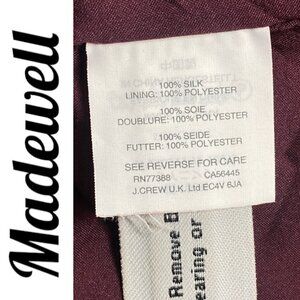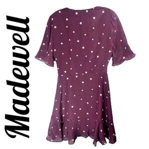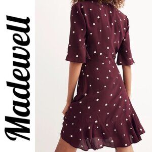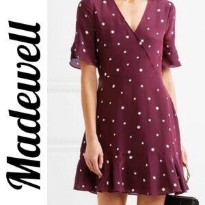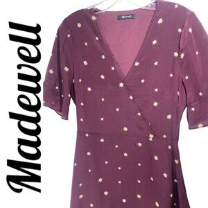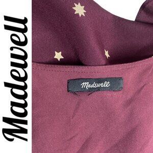 MADEWELL 100% Silk Burgundy Star Print Flutter Hem Faux Wrap Mini Dress, Small