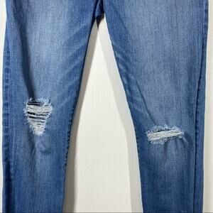 Madewell brand skinny jeans. High rise with a busted knee distressing and a raw cut, frayed edge hem. Medium blue wash. Size 27