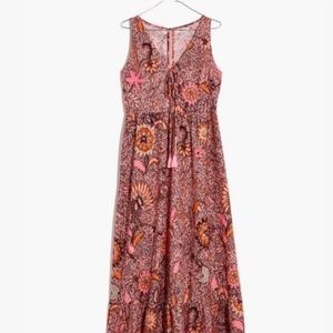 Madewell Bali Light Petal Block Print Midi Dress Sizes: various Features: boho dress, Madewell dress, bold floral, tassel ties, bra friendly straps, lace up, ruffled hem, spring dress, summer dress, fall dress, maxi, cotton viscose, machine washable, approx 50" in length