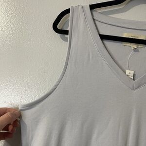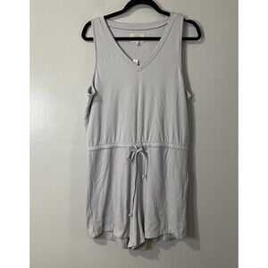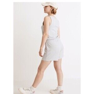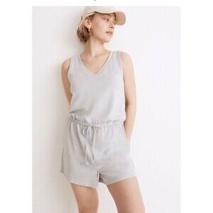 This Madewell Breeze Drawstring Romper in size medium is the perfect addition to your wardrobe. The sleeveless design and drawstring closure make it perfect for travel, activewear, or casual occasions. The romper features a solid pattern in a cool fog gray color and is made of a comfortable and stretchy cotton, modal, and elastane blend knit fabric.