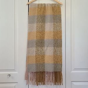 Supersoft and fringe-y, this oversized scarf comes in a perfect pink plaid. A cozy treat indoors or out.