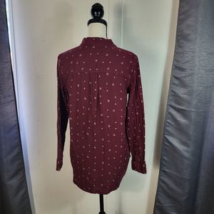 A classic slightly oversized and lofty button down! Cream ikat print on a wine burgundy back color. Button down front with a regular collar. EUC