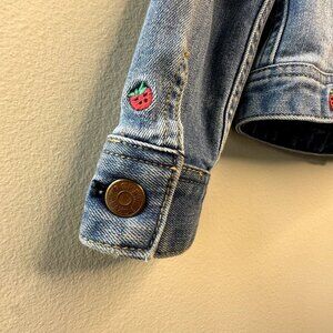 This Crewcuts denim jacket is in very good used condition. It has cute strawberries embroidered on it and the only flaw I see is a small stain on the back of the wrist.