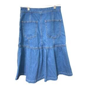 The MADEWELL Denim A-Line Skirt in size 23 is a stylish and versatile piece of women's clothing. Made from cotton denim in a classic blue color, this skirt features a button front closure and pockets, adding practicality to its A-line silhouette. The midi length and regular fit make it suitable for everyday wear, while the Madewell brand ensures quality and style. Perfect for a casual yet chic look, this skirt is a must-have for any woman's wardrobe.