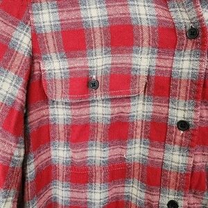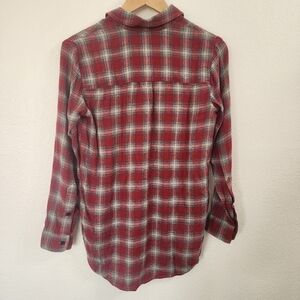 Red and gray plaid button-down shirt with rolled sleeves. Oversized fit. Size XS. EUC.
