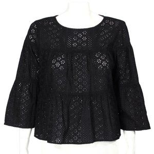 MADEWELL Eyelet Flutter Sleeve Button Back Tiered Black Cotton Top sz Small /328