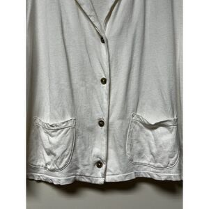 Boxy shaped knit "blazer" in soft 99% cotton, 1% elastane. Shirt collar with button front. Front patch pockets. Extra button attached to material's tag. Oversized.