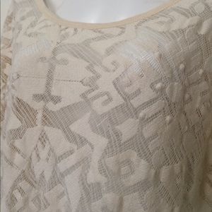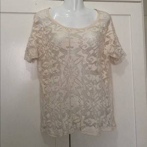 Pre-loved in great condition. Color is ivory. It's the perfect marriage: geometric embroidered lace in front and a super soft t-shirt panel in back. 16" across shoulders; 24" across chest. True to size. Stub cotton. Dry clean. Size L