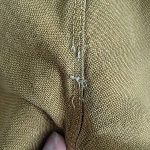 A bit of distressing on the stitching in one spot. does not take away from the look. Rustic casual look like free people.