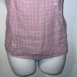 Made of an airy (and eco-friendly) linen blend, this easy puff-sleeve top has asymmetrical buttons that wrap around the front. Pretty purple checks give it an extra summery feel.