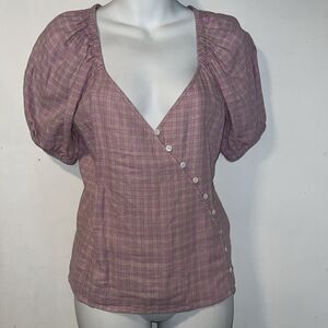 MADEWELL Linen-Blend Puff-Sleeve Button-Wrap Top in Lavender Plaid-S
