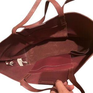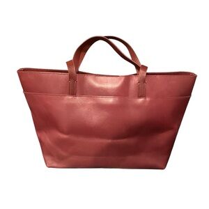 Stylish red leather tote bag perfect for any occasion: office, shopping, transit. The sleek Madewell design and spacious interior make it a must-have accessory. Elevate your style with this versatile bag. Magnetic close, exterior and interior slip pockets plus interior water bottle holder. This one is a stunner.