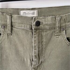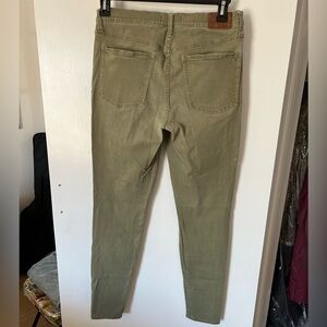 Madewell 9” High Riser Skinny Skinny jeans. Well-loved condition with lots of wear left! Soft and stretchy cotton with 2% elastane. Button and zip closure, belt loops, leather logo at back. Some soft pilling from washing, and some light worn spots, as shown above. The color is SO good: a lived-in olive/khaki green that is a neutral in its own right!