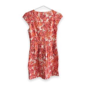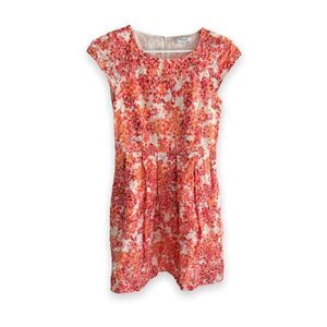 Adorable mini dress from MADEWELL! Cap sleeves, crew neckline, natural waist, flare skirt, and POCKETS! Size 0, but seems like it runs big. Lace over 100% cotton lining. Cream, red, and orange floral watercolor pattern. Lace is also a floral pattern. Great preowned condition! Hidden zipper in the back.