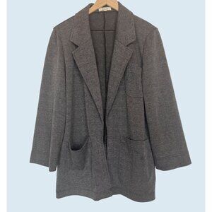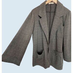 Great oversized blazer by Madewell. Soft knit fabric. Part jacket / part cardigan. Grey and black plaid. Ultra roomy from patch pockets. Super comfortable. 73% polyester, 26% viscose, 1% elastane. Size medium. Pre-owned and gently worn in really nice condition!