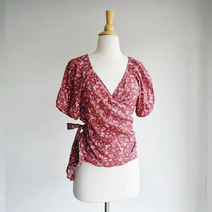 "With puff sleeves and a batik-inspired floral print, this is the cutest sunny-day top. A true wrap style, it can be adjusted to make it as cropped as you'd like."