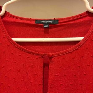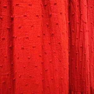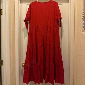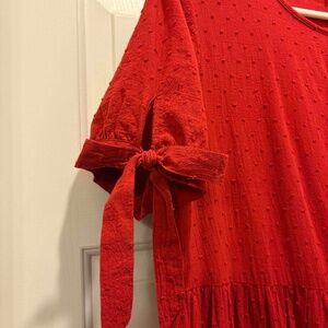 MADEWELL Red Cotton Prairie Dress - Size L -- 100% Soft Flocked Cotton -- fully lined with another layer of soft cotton. Measures 16” across the shoulder, 21” pit to pit. Maxi length. Approx. 50" long shoulder to hem. Cute tie detail on the sleeve. Looks great loose or belted. Great layering piece for Fall under a denim jacket. Gently worn and washed. From a smoke-free home.