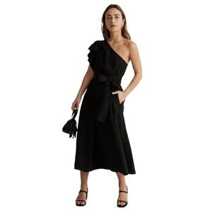 Madewell black midi dress, one-shoulder ruffle dress, little black dress, wedding guest outfit, minimalist formalwear, quiet luxury evening style, elegant cotton midi, timeless wardrobe staple, romantic core dress, modern event outfit, spring/summer party look, feminine resort style, soft dramatic silhouette, date night dress, black tie optional outfit idea.