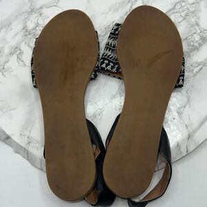 Black and White tribal pattern on canvas vamp strap with black leather slingback strap. Non slip sole. Excellent condition, size 9.5