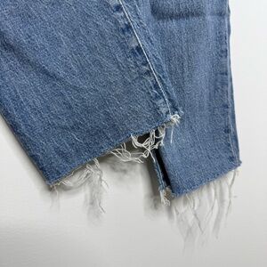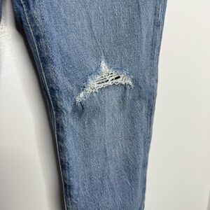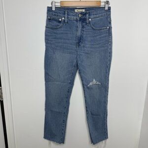 Madewell The Perfect Vintage Jean in Rosabelle Wash. Comfort Stretch Edition. Classic straight leg jeans. Light blue wash. Distressed detail on knee. Comfortable fit. Petite Size 26. Excellent Condition. No Flaws.