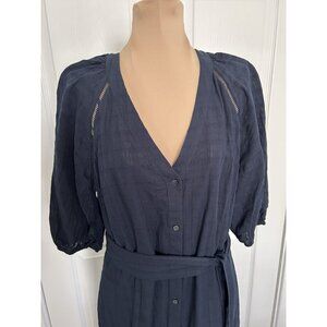 MADEWELL Tie-Waist Tiered Midi Dress Windowpane Navy Blue Button Up Size 8Elevate your wardrobe with the MADEWELL Tie-Waist Tiered Midi Dress, a versatile piece that blends effortlessly with both casual and polished ensembles. In a classic windowpane navy blue, this dress features a flattering V-neck and half puff sleeves, complemented by a belted waist that accentuates its midi length. The woven cotton fabric ensures breathability and comfort, while the lined interior offers additional coverage. The lining is a detachable slip w/ adjustable straps.Designed for the modern woman, this dress boasts a midi flair, ideal for day-to-night transitions. The button-up closure adds a timeless touch to the overall design. Available in size 8 the dress adheres to regular sizing standards, ensuring a great fit for a variety of body types.