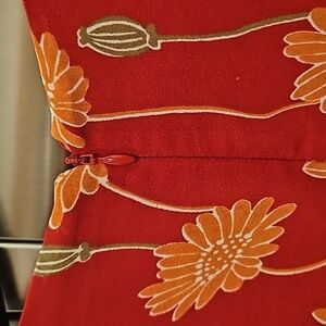 Print: Tall Sunflowers (dark red with orange, green, yellow botanical floral print)