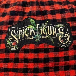 Back has a patch saying Stick Figure surrounded by plants and mushrooms