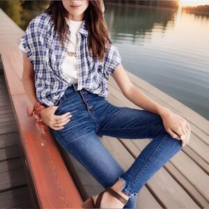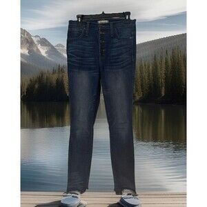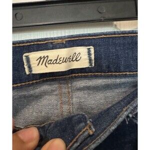 The product is a pair of Madewell Western 10" High Rise Button-Fly Chew Hem Skinny Jeans in size 28. These jeans feature a blue denim fabric with a slim fit, high rise waist, and a button closure. The chew hem accent adds a unique touch to the bohemian-inspired design, making them perfect for year-round wear in all seasons. With easy care features and comfortable stretch material, these jeans are a stylish and versatile addition to any woman's wardrobe.