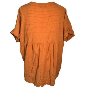 Chic and comfortable top by Madewell. This stylish orange blouse features a unique textured pattern throughout and a flattering V-neckline with a button-up detail. The short sleeves offer a relaxed fit, and the slightly gathered back adds a touch of feminine flair. Versatile and easy to style, this top can be dressed up or down, making it perfect for casual outings, brunch dates, or even a relaxed office environment.