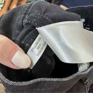Features faded black color, sturdy 99% cotton denim, high waist, ankle crop length and straight leg silhouette.
