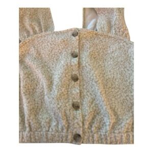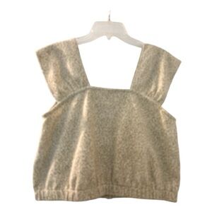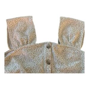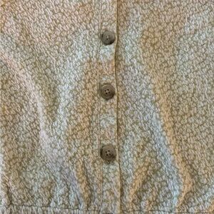 Cute and fun crop top, cotton blend fabric. Size medium. Dainty floral, beige and pale green. Unique shoulder squared off shape. Buttons down the front, faux, Elastic hem. Measurements: Bust: 18” Length: 19” from top of shoulder; 13” from the neckline. Width at hem: 18”