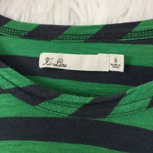 A closet staple, crew neck 3/4 length sleeves with rounded hem in a pretty green and navy. Size Small, approx: