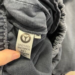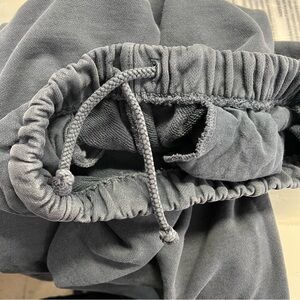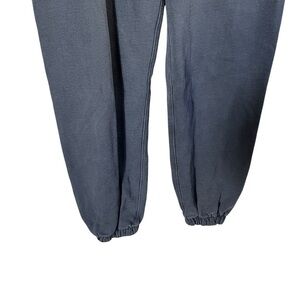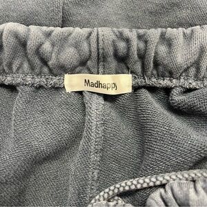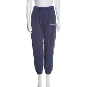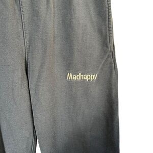 MADHAPPY Classic Embroidered Spell Out Relaxed Jogger Sweatpants. Faded navy indigo color. Hidden interior drawstring. Elastic waistband. Pockets. Embroidered logo. Elastic cuffs.