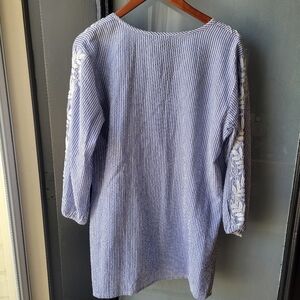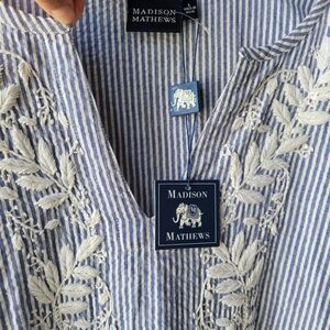 MADISON MATHEWS Blue White Striped Embroidered Tunic L Cotton 3/4 Sleeves RARE