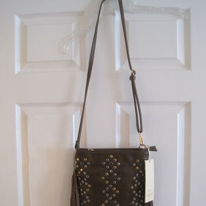 MADISON WEST LOS ANGELES BROWN CROSSBODY HANDBAG $55.00. THIS LOOKS JUST LIKE REAL LEATHER AND HAS THE WEIGHT OF REAL LEATHER. HAS GOLD AND SILVER STUDS ON ONE SIDE. FRINGE DETAIL. ZIPPER CLOSURE. THIS IS SO FUNKY! THANK YOU FOR LOOKING. PLEASE LET ME KNOW IF YOU HAVE ANY QUESTIONS.