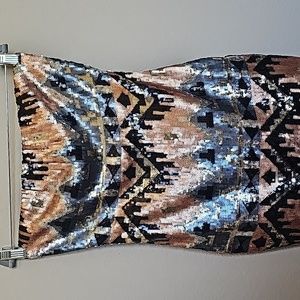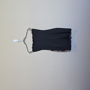 If you are going to an event where you want to shine this may be the dress for you! Front of dress has copper, gold, black, grey and siler sequence. Solid black back with zipper, there are no slits on this sleevless dress. There is no stretch to the front of this dress but there is stretch to the back. Tag states this a Medium but ckeck the dimensions as it seems to be smaller.