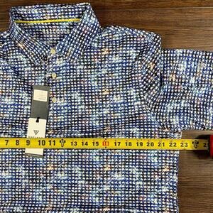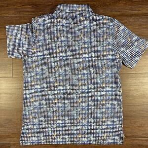 This MAELREG Performance Polo Shirt in size Large features a bold multicolor blue houndstooth pattern, designed for comfort and style on and off the golf course. Made with a moisture-wicking performance fabric, this polo delivers lightweight breathability and stretch, making it ideal for outdoor activities, casual wear, or athletic use. It has a classic polo collar with a three-button placket and a modern all-over print that gives it a standout look. Suitable for golf, summer outings, or everyday wear, this performance polo combines practicality with a stylish design.