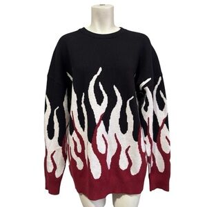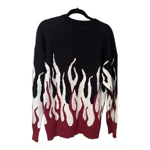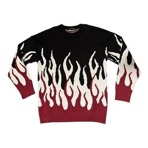 Sold out! Original MAENER pullover sweater with red, black and white flame graphics. Drop shoulders. Ribbing at bottom band, cuffs and crew neck. 100% acrylic, a soft thick substantial knit fabric. NWOT
