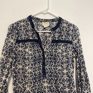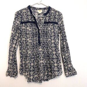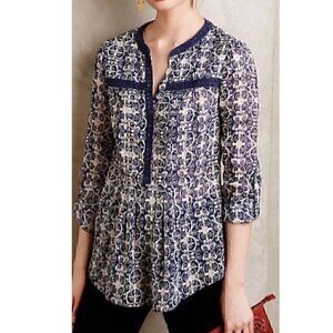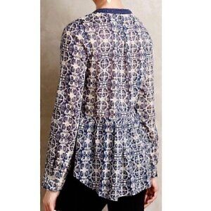 MAEVE ANTHROPOLOGIE Abella Pintuck Blouse Blue Cream Ivory Geometric Long Sleeve