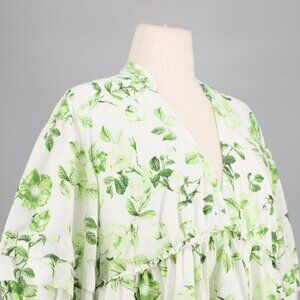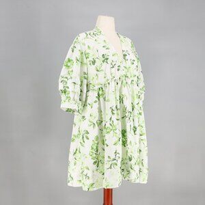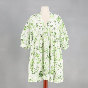 MAEVE ANTHROPOLOGIE V-Neck Floral Tunic Dress Puff Sleeve Green White Size L