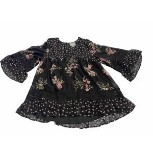 This gorgeous Maeve top from Anthropologie features a beautiful black and floral pattern, perfect for any boho-inspired outfit. The top has a relaxed fit and 3/4 bell sleeves with ruffle accents, giving it a feminine touch. The V-neckline adds a flattering detail to the sheer lace and eyelet fabric.