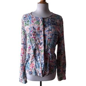 MAEVE Anthropologie Colorful London Map Street scene Rayon Blouse. But in front. With pockets. High low Hem.