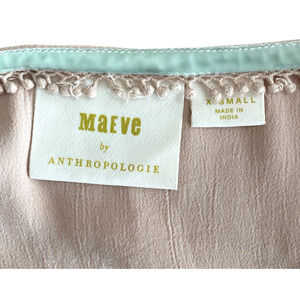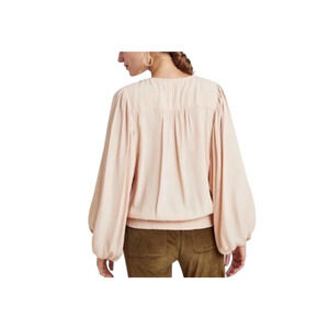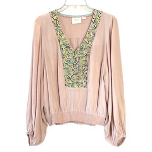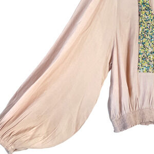 MAEVE by Anthropologie Women's Size XS Blush Pink Beige Sequin Lightweight Long Balloon Sleeve V-Neck Pullover Top. Multicolor Sequin Detailing. Elastic Waist. Made in India. Machine Wash.