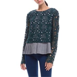 MAEVE BY ANTHROPOLOGIE GABRIELLA LACE OVERLAY GINGHAM PEPLUM BLOUSE W BOW DETAIL
