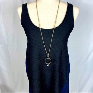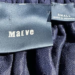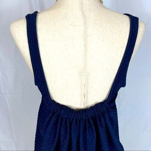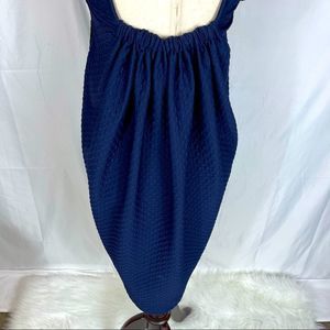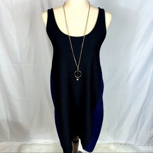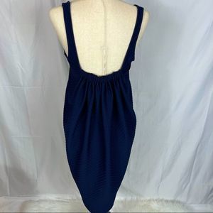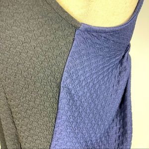 Maeve for Anthropologie dress, textured fabric, unique gathering in back, color block black in front, navy blue in back. Scoop neck, stylish, perfect condition