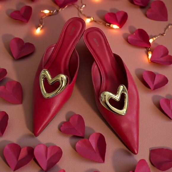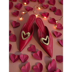 Elegant red leather mules with a gold heart detail offer a stylish touch to any outfit. Perfect for both casual and formal occasions, these heels combine comfort with chic design, making them a must-have for any wardrobe.