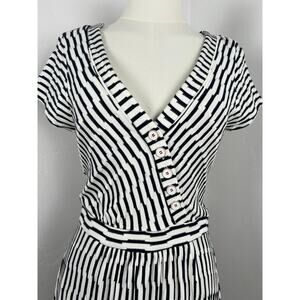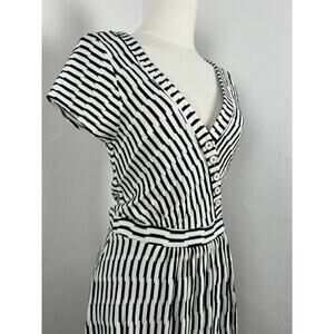 V-neck short-sleeve wrap style Midi dress in Black and White textured stripe