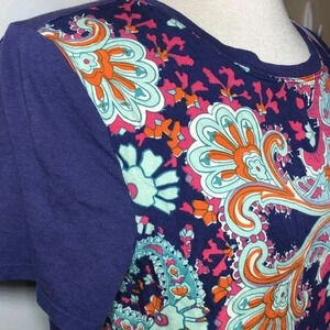 Anthropologie Maeve Purple Paisley Overlay Maddie Printed Top, Short sleeve crewneck tee. Paisley scarf print layered.