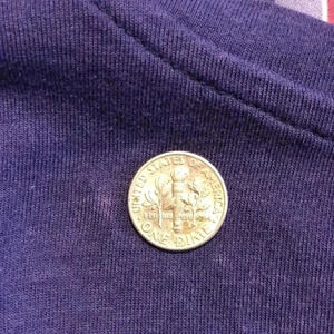 Please review all pictures, before making your purchase. Note: Tiny bleach spot on backside near left neckline. See last picture with the dime in it.