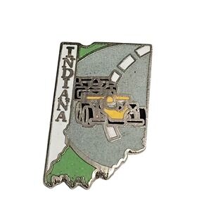 A vintage Indiana state pin, a collectible souvenir showcasing the state's outline. This lapel pin features a detailed race car design, set against a backdrop representing the Indianapolis Motor Speedway. The word "Indiana" is prominently displayed along the side. The pin is secured with a standard pin backing. Perfect for adding a touch of Indiana pride to your jacket, bag, or hat, or for displaying as part of a pin collection. This pin would be a great accessory for race day events or casual wear.